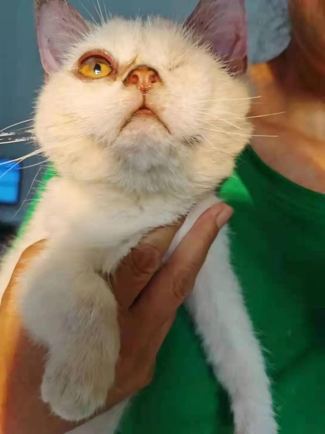 And this cat, Xiaobai, who was abandoned by the owner, is covered with cats Moss, the right eye was swollen like a light bulb because of the infection of calicivirus, and it was unbearable to look at.