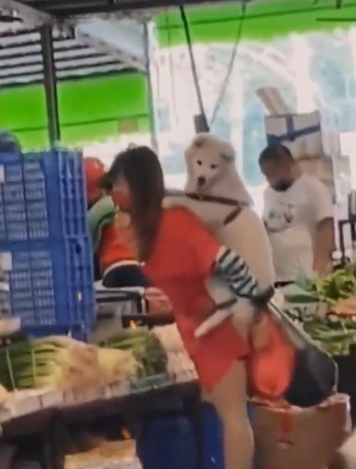 From a distance, I found that the woman's back was covered with a vast white thing. When I got closer, I found that it was a huge dog. The dog's coat was all white, and it should be a Samoyed. It is truly worthy of its name, praised as a smiling angel, it must have been carefully taken care of by its owner, and it looks so healthy and delicate. In fact, it goes without saying that everyone can see that, after all, when you go out to the vegetable market to buy food, you don't choose to lead the dog, but carry it on your back, which shows that women cherish it. But everyone really can't ignore this big dog that looks like 20 pounds or even 30 pounds. Although the dog is firmly tied to the back with a rope, it is still under load, and the woman is also wearing an inconvenient skirt and High heel. Although we can understand the psychology of this woman's love of dogs, everyone must think that her behavior is a little funny. Most people will think that this behavior is somewhat strange and abnormal, although her behavior has nothing to do with others. But I still want to say that cherishing pets requires moderation. Sometimes what you think is good is not a good thing for it. After all, most dogs like to run freely.