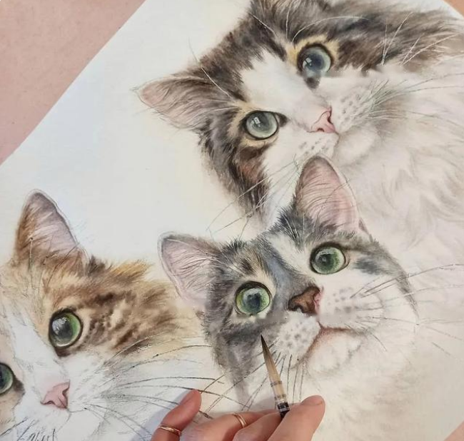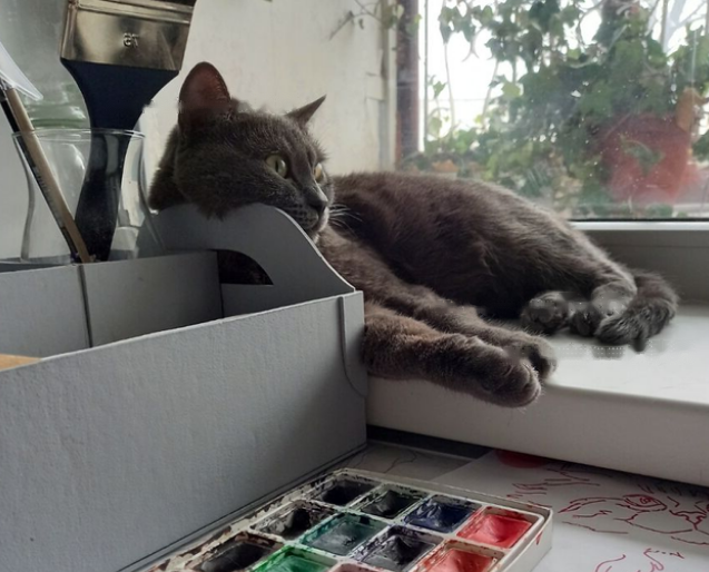 When I got home, I wanted to process the sketches, and Umka would come over curiously to join in the fun. Looking at the paint on the table, Umka, who knew that she had no artistic talent, finally lay down obediently and patiently waited for Olga's new work to come out. Not long after, the three stray cat brothers I saw just now came alive on paper!