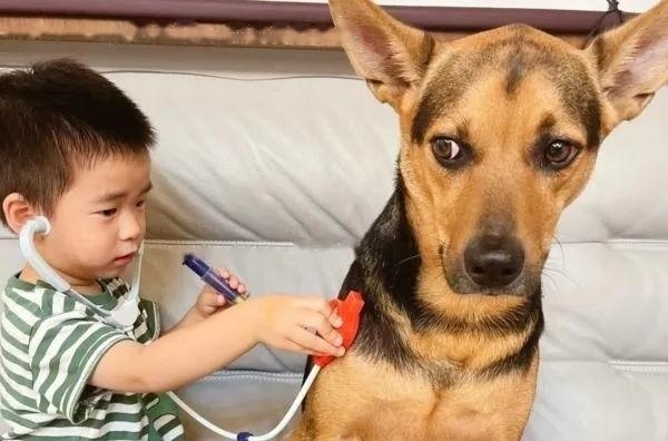 This Mixes dog, named Abu, is a very competent babysitter.