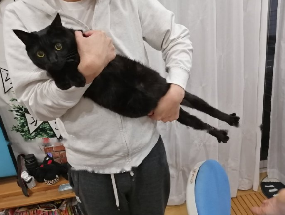 The black cat being held by the shit shoveling officer straightens his thighs hard, pushes harder, and pushes harder, the thighs will be longer.