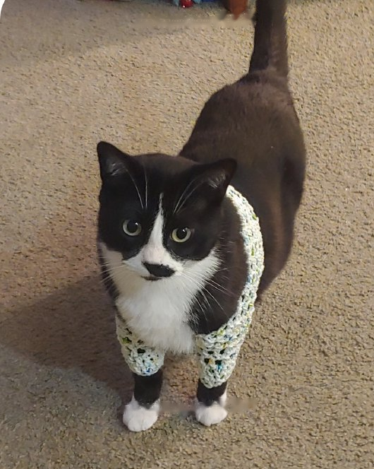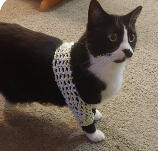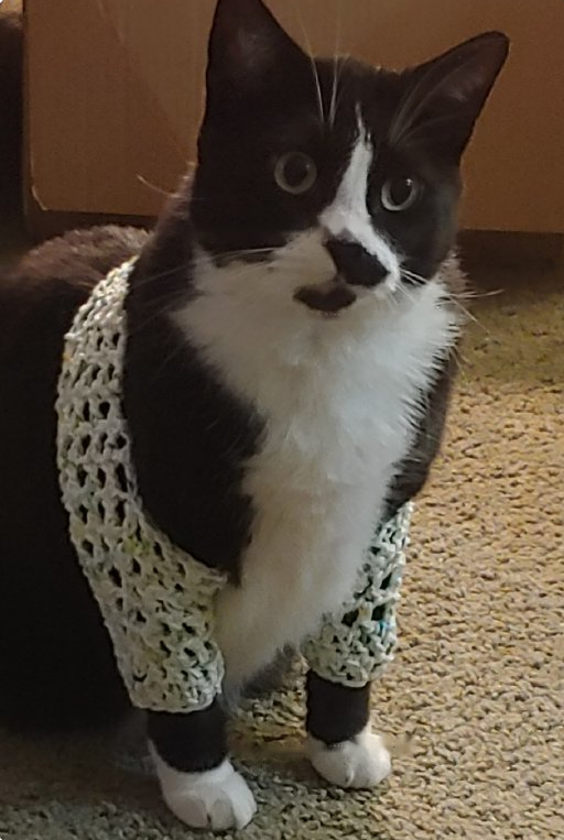 The cow cat has a little injury on its leg. In order to prevent it from licking, the shit shovel officer specially knitted a set of protective equipment for it.