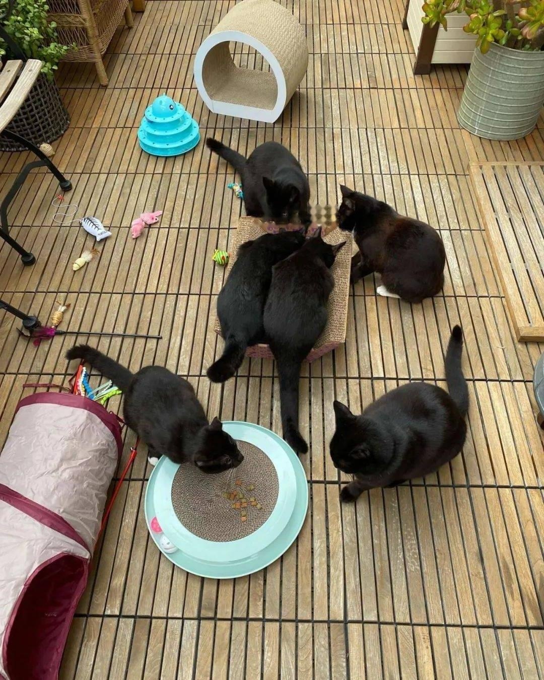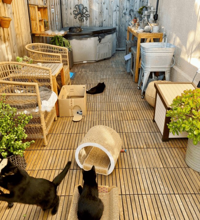 Bourne was not idle either. She turned the backyard into a playground for stray cats, providing them with toys, scratching boards, tunnels, cat houses, and more.