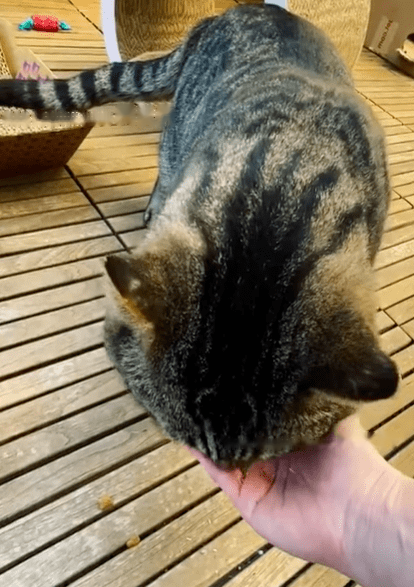 Byrne said: He doesn't look like a cat that has been successfully approached by humans. But now he's actively eating from my hand and willing to let me pet it.