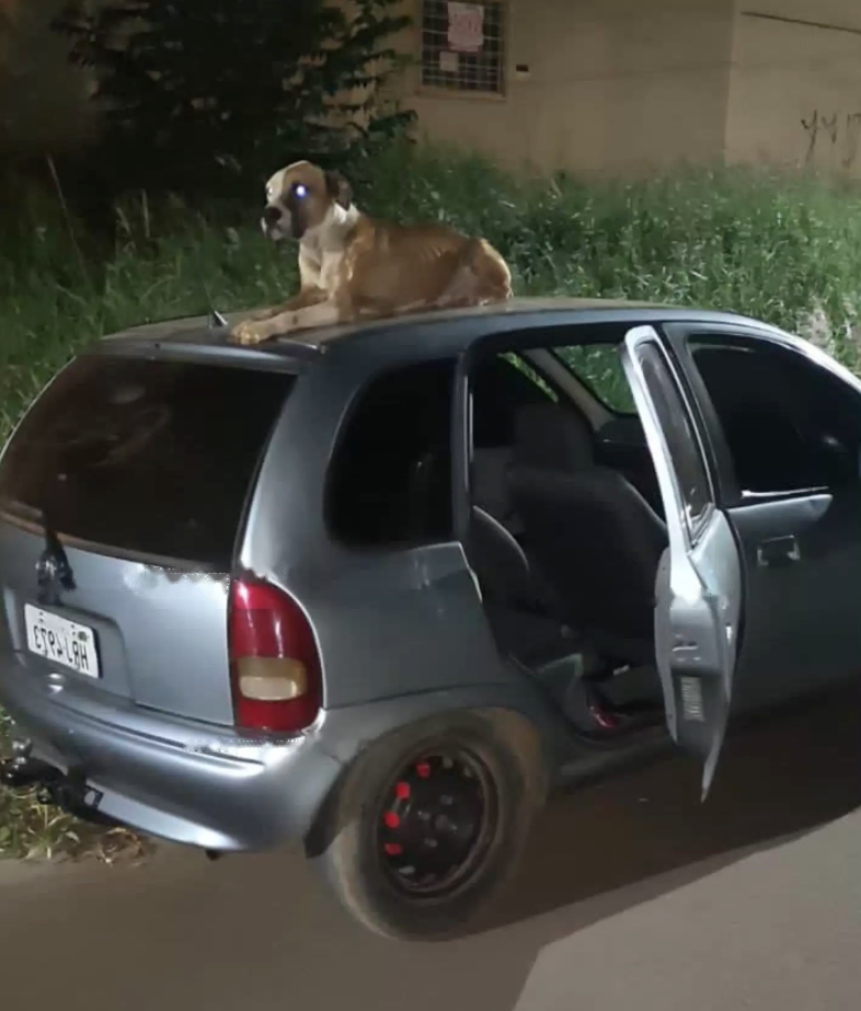The police are now puzzled: there is a dog lying on the roof of this car. It seems to be protecting the car and not letting anyone approach it.
